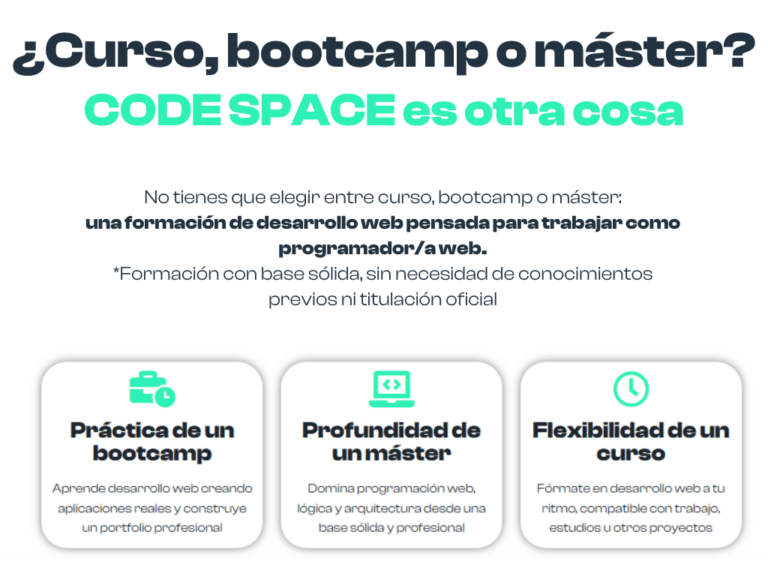 El curso de Desarrollo Web de CODE SPACE está diseñado para reunir lo mejor de tres formatos formativos: